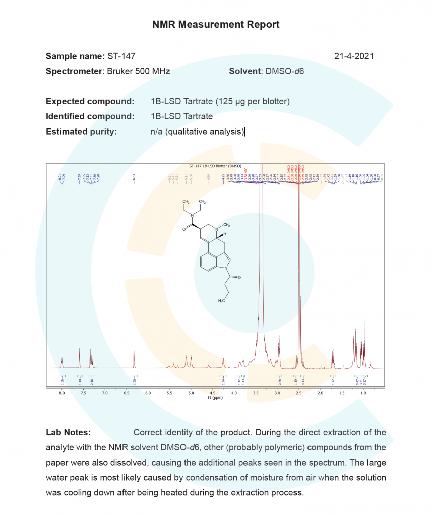 If you wish to see NMR results for 1B-LSD blotters or any other chemical, please email us at requests@chemical-collective.com.