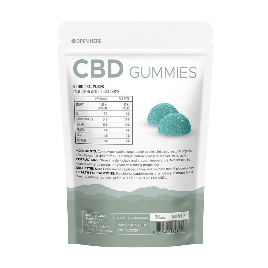 Full spectrum CBD Gummies, containing 25mg of CBD per gummy. These delicious blueberry flavoured gummies are sustainably sourced and 100% vegan. CBD is a natural anti-inflammatory used to relieve the symptoms of a wide variety of conditions, or just as a general wellness health supplement. In addition to CBD, these tasty gummies also contain other beneficial cannabinoids such as CBG, CBDV, CBN and minor traces of THC.