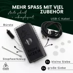 Contents:Stilus Pro Max, screwable mouthpiece, brush & tamping tool, USB-C cable, 3 sieves for heating chamber, 2 sieves for mouthpiece, 18650 battery